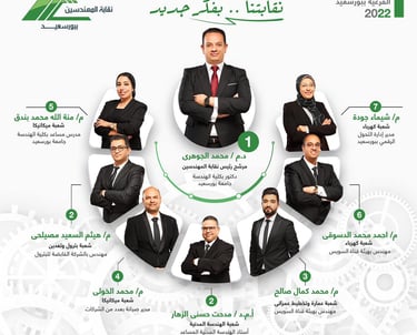 قائمتنا تضم مهندسين من جميع التخصصات، خبراتهم متنوعة وتجاربهم مختلفة، لكن يجمعهم هدف واحد: إعادة نقابة المهندسين في بورسعيد إلى مكانتها الحقيقية. نعمل معًا بتناغم، كل عضو يساهم بخبرته، وكل قرار يُتخذ لمصلحة المهندس، ليكون صوت كل مهندس مسموعًا، وتكون النقابة مثالًا على الإدارة الفعّالة والشفافة.