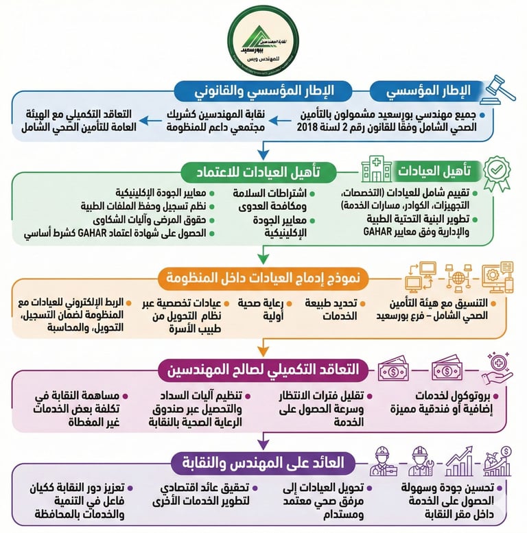 انطلاقًا من تطبيق منظومة التأمين الصحي الشامل بمحافظة بورسعيد – كأول محافظة يُطبق بها القانون رقم (2) لسنة 2018 – وإيمانًا بدور نقابة المهندسين في تعظيم الاستفادة من هذه المنظومة لصالح أعضائها، نسعى إلى الإدماج الكامل لعيادات مبنى نقابة المهندسين ببورسعيد ضمن منظومة التأمين الصحي الشامل، وفق رؤية واضحة وخطوات تنفيذية محددة.